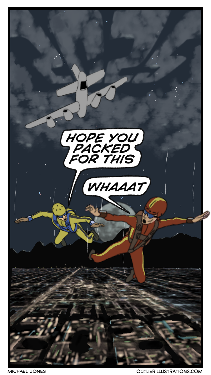 I created this illustration with the idea how everyone feels like their in a free-fall. My idea of how to approach these times is to treat the transition from 2025 to 2026 as skydiving instead of being in an out-of-control free-fall. As long as we have packed for the jump everything will work out; if not, a definite chaotic year will be ahead for us all.